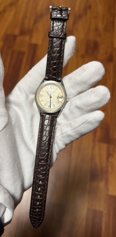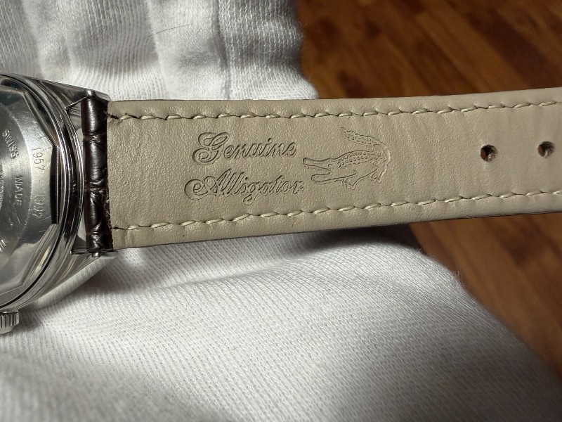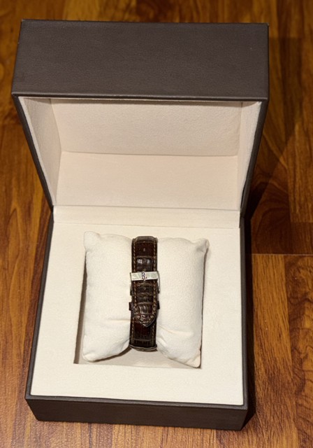 L'OROLOGIO E' EQUIPAGGIATO CON IL SUO CINTURINO ORIGINALE IN PELLE DI ALLIGATORE MARRONE DA 18 MM, AL QUALE E' STATO AFFIANCATO UNO SPLENDIDO CINTURINO SEMPRE IN PELLE DI ALLIGATORE MARRONE DA 18 MM MARCA MAIKES.